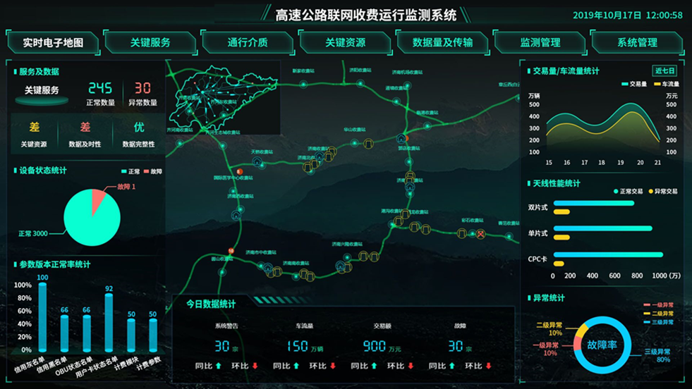 该产品对高速公路收费系统设备运行情况、数据传输情况进行监测,以实现对联网省份内的收费站、门架中设备运行情况进行实时监测;通过对各路段设备上传数据量与省联网中心接入数据量情况的统计分析,完成对站省两级间数据传输情况的实时监测;通过每日数据传输情况分析,对各个数据接口数据传输量级制定预警阈值,便于实时监控每日数据传输情况。