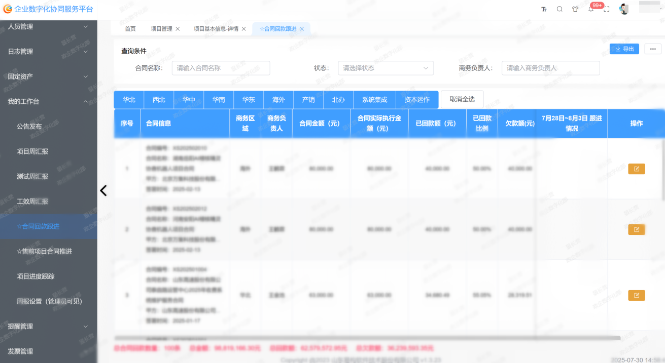 合同生效后,要求每周在企业数字化协同服务平台上更新回款计划及执行动态,并与项目执行进度深度绑定——研发中心每日同步的研发进展将直接关联回款监管指标,形成双向联动机制。