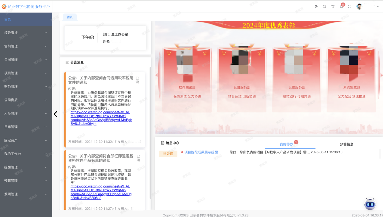 易构软件在积极推进公司精细化管理的过程中,深刻洞察到公司的管理痛点,针对性地研发并落地了企业数字化协同服务平台,构建了全流程管控体系,让每一个环节都清晰可控,通过在公司内部的高效应用,逐步解决了以上管理痛点,有效提升了公司整体运营效率、跨部门协同效能以及项目管理的精细化水平,显著降低了运营成本与潜在管理风险。
