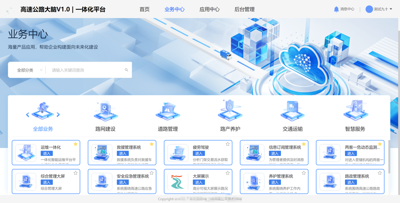 以数据为核心、业务为驱动,采用唯一平台与中心模式,整合路网建设、道路管理、路产养护、交通运输、智慧服务等业务入口,实现全面数据管理与资源共享,为数字化生态建设奠定基础。