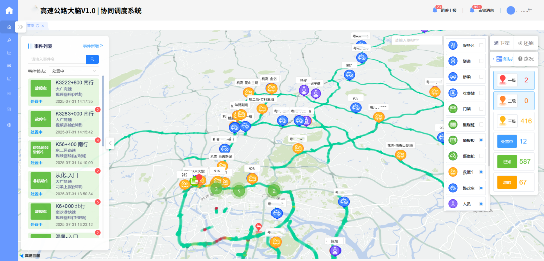 (1)协同调度:围绕道路事件,实现涵盖事件管理、指挥调度、后评估、应急预案、危险源管理及应急演练的全流程管控。