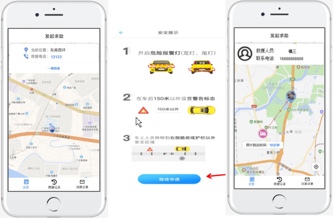 (2)救援管理(司机端):公路护栏设救援二维码,司机扫码进入小程序求助,查看救援距离及人员信息。